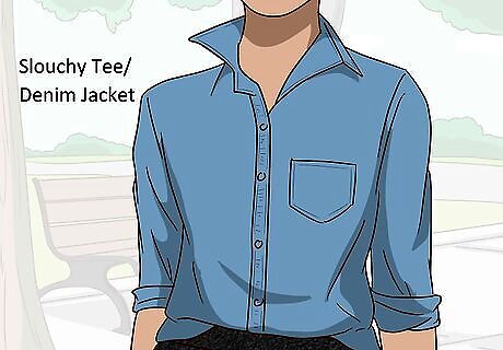 Dress it down with a slouchy tee or denim jacket. To dress your velvet down, use casual staples, such as a chambray shirt, a simple tee, or a jean jacket. Basic closet items will lend a simple edge to your skirt, and will automatically remove the formal air from the ensemble.