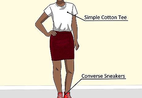 Pair your skirt with basic knits. A simple cotton tee tucked into your velvet skirt will immediately make the richness of the velvet seem more casual. Topping it off with a pair of Converse sneakers will complete the casual effect. A fisherman’s sweater is another great way to pare down your velvet skirt in cooler weather.
