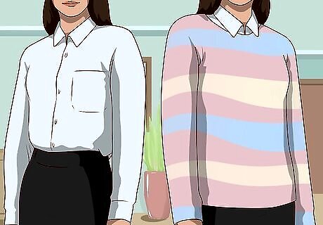 Dress with layered tops for flexibility in cooler weather. Layering tops means you can add or remove layers depending on the weather or indoor temperature. Start with a tank top or sleeveless top, add a short or long-sleeved button-up blouse, and then top it off with a sweater or sweatshirt for warmth. For example, start with a colorful tank top with a white, long-sleeve button-up blouse on top. Then wear a funky sweatshirt, with a fun image or text, on top. Another example, wear a white tank top with a low-neck or off-the-shoulder sweater on top. Replace the sweater or sweatshirt with a knit vest in spring or fall weather, or when you’re going to wear a jacket. Don’t be afraid to wear a denim top with a denim skirt. Select a top that’s a different shade of denim from the skirt.
