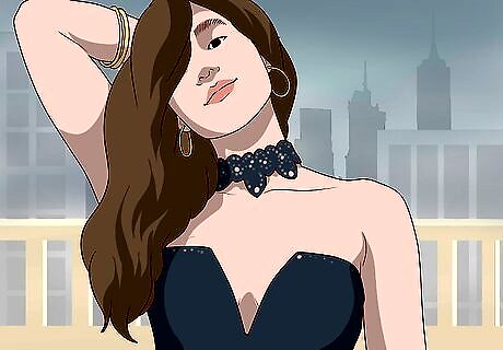 Add sparkly accessories to stand out. You can opt for a minimalist look by wearing a simple pair of silver or gold loop earrings to your outfit, but no other accessories. Or you can select earrings, a necklace, and a bracelet with some bling to add sparkle and class to your outfit. If you’ve opted for an all-black evening outfit, try adding a colorful and bright necklace to the outfit. If you have a long neck and have opted for a low-cut top, add a lace choker to your outfit.