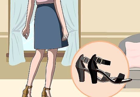 Wear heels to elongate your legs. For the full work look, choose heels to wear with your mid-length a-line skirt. The heels will also help define your legs and, and for shorter women, will make your legs look longer. Also, choose shoes that are skin-tone rather than shoes that match the color of your skirt, to make your legs look longer. For example, select simple skin-tone stilettos to go with a skirt of any colour when wearing sheer or skin-tone pantyhose.