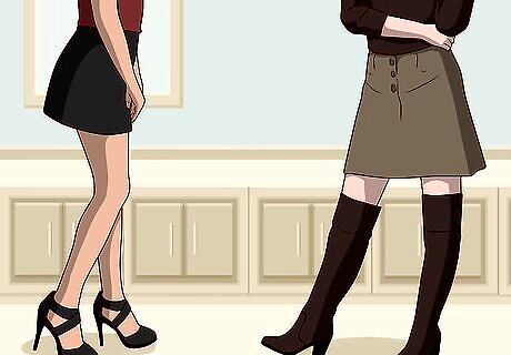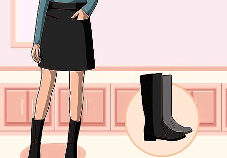 Select a pair of boots if heels aren't your thing. Ankle boots, worn with tights of the same color, look great with a mid-length a-line skirt. Knee-high boots can also be worn with mid-length a-line skirts, either with or without pantyhose or tights. Black above-the-knee boots can also look really elegant when worn with black tights and a skirt that ends above the knee. If you want to make your legs look slimmer in your knee-high boots, opt for a pair that are simple and sleek, not a pair that slouch or have loose fabric.