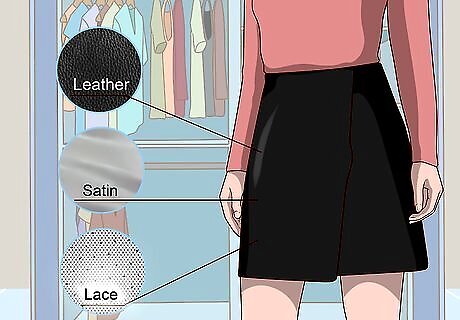 Select leather, satin, or lace to dress things up. When wearing an a-line skirt to an evening event, party, or a night on the town, look for one made of leather, satin, or even layers of lace to dress-up your look. You can also select a skirt that’s made from a material with a metallic sheen to it to add a bit of sparkle. Another option is to select an a-line skirt with a solid fabric as a lower layer and a sheer fabric as a top layer. If your skirt has belt loops, add a belt that’s the same color as the skirt so that it blends into the skirt.