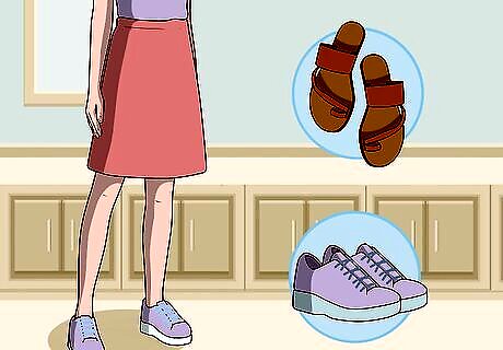 Wear sneakers or sandals and keep your legs bare in warm weather. If you’re wearing your a-line skirt in warm weather, treat your a-line skirt like a pair of shorts and keep your legs bare. Keep your feet bare as well and wear a pair of casual, flat sandals. If it’s cooler weather, or if you’re going to participate in more active events, add ankle socks and sneakers to your outfit.