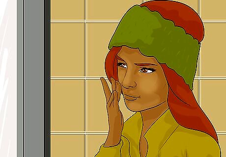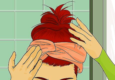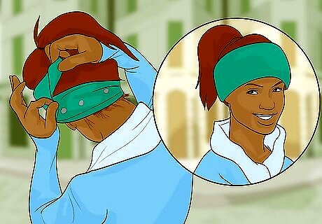 Put your hair in a bun or high ponytail. If you are wearing a headband-style ear warmer, putting your hair up in a bun will make it easier to fit the ear warmer over your head without messing up your hair. Use a hair tie or hair clip to give yourself a high ponytail or bun before you put on your headband ear warmer. You can also use a jaw clip to put up a portion of your hair while the rest of it hangs. This will give you a more bohemian look. Putting your hair up is not required, but can help prevent messing up long hair.