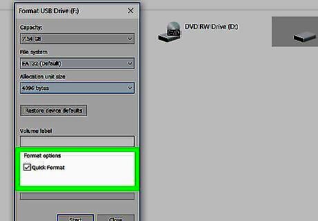 Choose whether to quick format. You can save time by checking the box next to “Quick Format,” but this option makes it easier for someone to restore your deleted data with the right software.