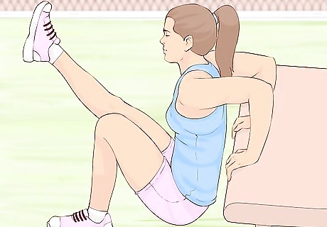 Dip and kick. The dip and kick exercise can be done on a park bench or table at the playground. This exercise can be punishing for your triceps, as well as working your thighs and your core. Find a bench the right height that when you sit on the edge, you have your feet flat on the ground and your knees are at 90-degree angles. Press your palms into the bench on either side of your body, lifting yourself up slightly off the bench. Pick one foot up so you're holding it slightly off the ground. Lower yourself by bending your elbows to 90 degrees, pulling your knee close to your chest as you do. As you straighten your arms to raise back up, kick your foot straight out in front of you. Complete 10 repetitions of this exercise, then switch sides and do another 10 repetitions with the other leg.