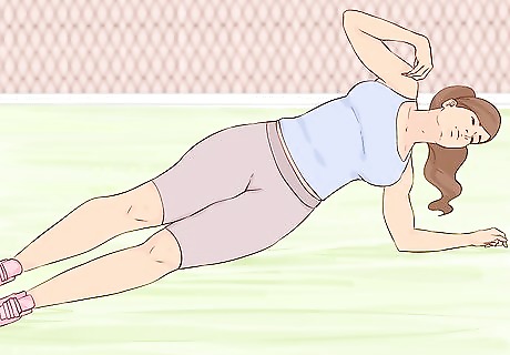 Get balance and elevation for planks. Planks are a punishing workout for your core. If you want even more difficulty and strength-building, grip a swing and lower into a plank. The unstable swing makes the exercise more difficult. Make sure your feet are firm on the ground, and don't push the swing out any further than you can reach with stability, or you could end up falling face-first onto the ground. You also can reverse these by hooking your feet around the swing and planting your hands firmly on the ground. Check out the surface under the swing set before you start, and make sure it's smooth and firm. If the playground has wood chips, for example, you might find this exercise painful because the chips will dig into your palms if you have your hands on the ground. If you have a long-sleeve shirt on, then try resting your upper body weight on your forearms while your feet are on the swing.