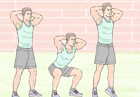 Try jump squats. Provided the bench is strong and stable enough, you can work jumps into a regular squat to add explosive movement and a touch of plyometric exercise to your workout, building fast-twitch muscle fiber. Check the playground for platforms that you can jump up on, or use a sturdy park bench if no one is using them. To start, stand a couple feet away from the bench and jump up onto it. This is an exercise similar to box jumps that you'd do in a gym. Aim to land softly, and step back down carefully rather than jumping back down off the bench. Try to do this exercise as quickly as possible, doing as many as you can do in 30 seconds. You can progress to jump squats, in which you lower into a squat and then jump onto the bench. This exercise works best, and is safer, if you're on relatively level ground. However, you can also try doing jump squats onto the swings if the seats are flat and sturdy enough. Just hold onto the swing chains and jump up onto the swing seat. Then step back down and start over.