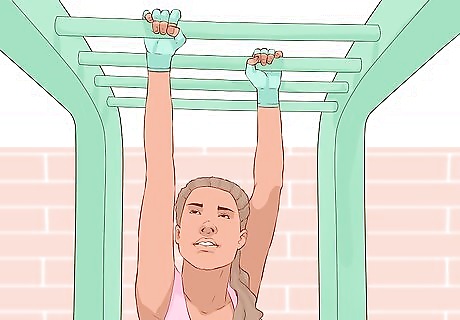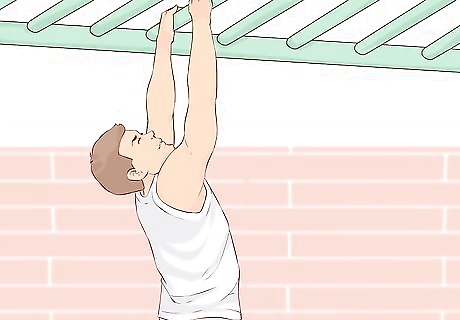 Travel across the monkey bars. You may have enjoyed scrambling over monkey bars as a kid, but crossing them as an adult is a different matter with your entire body weight as resistance. Climbing and swinging across monkey bars builds core and grip strength. Start slow if you don't have the core and grip strength to travel across them at a pace. Once you're stronger, practice going forward and backward. You also can incorporate sprints, in which you go forward and backward as fast as you can, as many times as you can, for 30 seconds. Use the sway in your body to build momentum. Stretch your reach by only using every other rung, or keep your legs curled close to your body for a little added resistance and core stability.