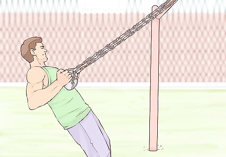 Do rows on a swing. Rows are a good exercise for strengthening your upper body and your back. If you're not strong enough to do repeated pull-ups or chin-ups, this exercise can help build the same muscles used for that exercise. Find a swing and grab the chains from which it hangs. Pull it back toward you, leaning back with your upper body. You may have to shift your feet a bit until you find a stable position. Stop when you're at an angle from the ground – the deeper the angle, the more difficult the exercise. Lean back so that your arms are straight, then pull up towards the swing, bringing your elbows to your side. Extend your arms and do three to five sets of 10 repetitions of this exercise. To build the right muscles and avoid straining your wrists, focus on pulling from your elbows rather than using your hands.