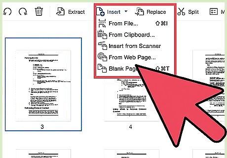 Insert a new page. Pressing the Insert tool reveals a menu with options similar to new PDF creation: “Insert from File”, “Webpage”, “Scanner”, “Clipboard”, or “Blank Page”. Any selection will add the new page to the end of the document. This menu can also be accessed from the “+” button next to any of the page thumbnails. This method will insert the new page in this location. You may insert any filetype supported by Acrobat. It will be integrated into the .pdf like importing any other file. Free users can still merge PDF files using a variety of online services. Typically the process involves uploading each file to the site, selecting the order, and downloading the merged file. In this case, usually all of the files must already be in the PDF format in order to be merged.