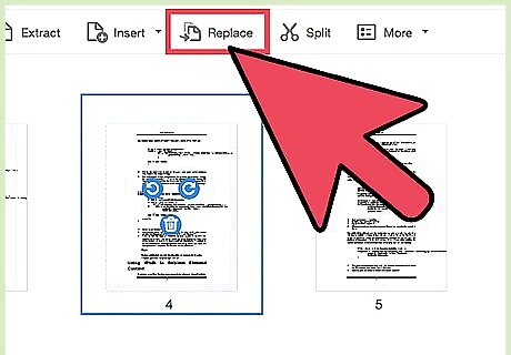 Replace an existing page. Click the thumbnail of the page you want to replace and press the “Replace” button. Browse to the location of the desired replacement page, select it, and press "OK" to confirm the page replacement. Multiple pages can be replaced with your page selection by selecting a page range from the box prior to confirmation. Note, the replacement page must be an Acrobat supported filetype.