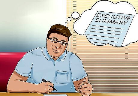 Write the executive summary last. Even though it belongs at the beginning of the proposal document, the executive summary is written last. This is because it provides a summary of all of the relevant information in the loan proposal. Develop this summary as you gather your documentation for your loan. Writing the executive summary last reflects a thorough understanding of the purpose of the loan proposal. Writing it at the end of the process also makes it more persuasive. Limit the length of the Executive Summary to less than a page.