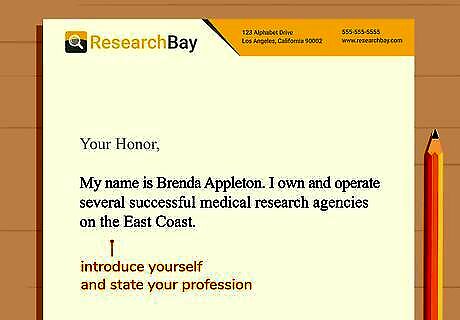 Write who you are and what your profession is. In the first paragraph of the letter, you should begin by introducing yourself and saying what your profession is. Do not be modest about your credentials, particularly if you are held in high esteem in your community because of your professional or private work. Highlighting your credentials shows the defendant’s reputation and relationships in the community in a positive light. For example, you can write: "My name is ____________________, M.D., a practicing physician and Chief of Staff of ________ Medical Center in ________________, Florida."