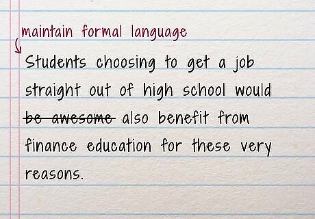 Use appropriately formal language. A thesis should not use contractions, slang, or swear words. Keep your essay appropriate for its scholarly context: it should be professional and objective.