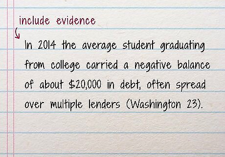 Analyze evidence in every paragraph. Every paragraph should include some kind of evidence, such as a quotation from a primary source (like a letter or poem), analysis from a secondary source (such as a quotation from an expert historian or the result of a previous scientific study), or the results from your own research investigation (such as the results from a survey you administer). Remember that you have to analyze your evidence: don't simply list it. Explain why you think each piece of evidence is relevant and important. If possible, try to come up with your own interpretation of the evidence.