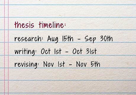 Make a timeline. One of the most useful things you can do before you begin writing is to carefully plan the trajectory of your research, writing, and revising process. Be sure that you leave yourself plenty of time to accomplish each task, and leave yourself some leeway in case you encounter any roadblocks in your research. Depending on the length and expectations of your thesis, you might spend anywhere from a few weeks to over a year working on a thesis.