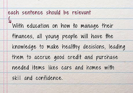 Make sure each body paragraph is relevant to the thesis. A paragraph is a set of sentences unified by a single idea or closely related set of ideas. You should treat each paragraph as a separate piece of writing in order to ensure that each paragraph is well-organized and unified. However, each body paragraph must also work in order to further your support of your overarching thesis statement. Make sure that you are not including any irrelevant information or digressions. Topic sentences are a great way to ensure that your body paragraphs remain focused. Ask yourself whether the topic sentence of each paragraph supports your thesis statement.
