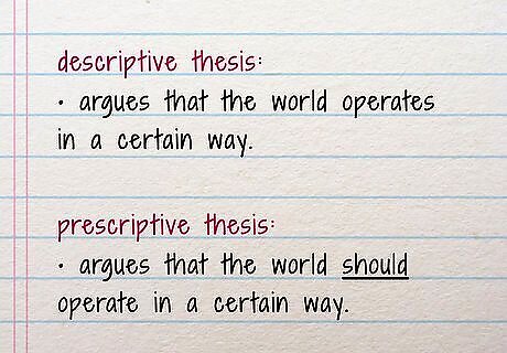 Determine whether your thesis should be descriptive or prescriptive. A descriptive thesis argues that the world operates in a certain way. A prescriptive thesis, on the other hand, argues that the would should operate in a certain way. Depending on your field of study, you might be expected to craft a descriptive argument or a prescriptive argument. A persuasive thesis can take either form. For example, "Voter ID laws discourage minority voters more than white voters" is a descriptive thesis. "Voter ID laws should be abolished in order to maintain a democratic form of government" is a prescriptive thesis.