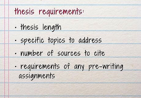 Understand the thesis assignment. Some instructors, colleges, and universities have very strict requirements about what a thesis must include. Read your syllabus, assignment rubric, or course website thoroughly in order to understand exactly what is required of you. Some questions to ask yourself include: How long must my thesis be? Are there any specific topics I must address, or must I come up with my own topic? How many sources must I cite? Do I have to submit any pre-writing assignments (drafts, outlines, bibliographies, proposals, etc.)?