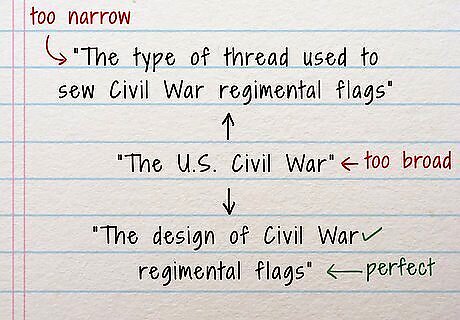 Narrow down a research topic. Sometimes your research topic is provided to you by an instructor or university. At other times, you are responsible for brainstorming your own research topic. You can consider framing your research topic as an interesting question to answer or as a tough puzzle to solve. If you are coming up with your own topic, be sure to ask yourself the following questions: Is this topic something I am passionate about? Remember that you might spend several weeks or even months working with this topic, so it should hold your interest. Is this topic relevant to the assignment? Always adhere to the restrictions of the assignment. Is this topic broad enough to provide me with flexibility, but narrow enough that I can contribute meaningfully to it? For example, "The U.S. Civil War" is probably too broad of a topic to be manageable. On the other hand, "The type of thread used to sew Civil War regimental flags" might skew too far in the other direction by being too narrow to sustain a lengthy thesis assignment. "The design of Civil War regimental flags" is a topic that is just right: broad enough to provide you with plenty of research and flexibility, but narrow enough that you will not be overwhelmed.