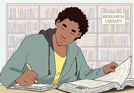 Use a research library to acquire sources. Many colleges and universities have a research library that has extensive holdings that include periodicals, books, and other media (such as films or photographs). Use the library catalog search engine in order to narrow down some potential journal articles and books for you to read. Remember to scan the shelves that surround the book titles you acquired during your search. Many libraries shelve according to subject, and there might be relevant materials in the immediate vicinity of the books you identified. Research libraries often employ research librarians who can help you identify additional sources and databases to aid you in your search. Talk to the library staff to see if someone might be willing to assist you with your research project.