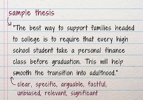 Write down a tentative thesis statement. Your thesis will be governed by your thesis statement, which is a clear and concise summary of your argument. A thesis statement is usually 1-3 sentences in length. Having a tentative thesis statement at the outset can help your paper remain focused and grounded. However, as you continue researching you might find that your thesis is somehow inadequate and must be revised. This is a normal part of the writing process. Remember that your thesis must be: Clear Specific Arguable Rooted in facts, not pure opinions (though sometimes expert opinion can count as evidence) Non-judgmental and non-confrontational Relevant to the assignment Significant