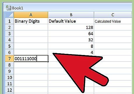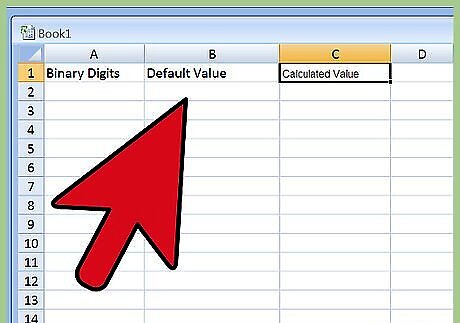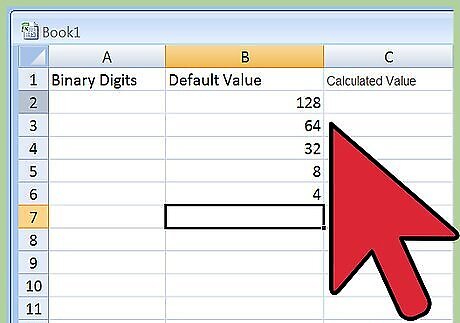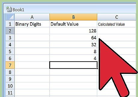 Grab some paper to prepare a worksheet. Create three columns. Label one “Binary Digits,” label the second “Default Value,” and label the third “Calculated Value.” Since binary numbers include eight digits, create eight rows across all three columns. Next, in all eight rows, write the multiplication sign in between Column 1 and Column 2, and then do the same with the "equals" sign in between Column 2 and Column 3, so that Column 1 x Column 2 = Column 3 across the board.