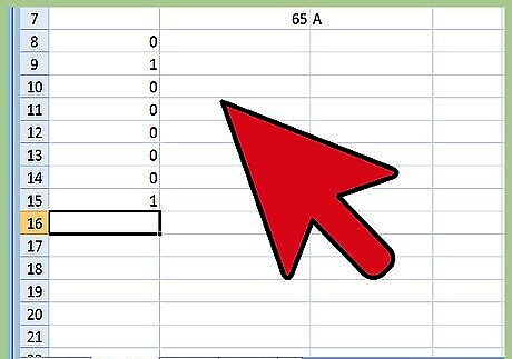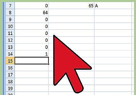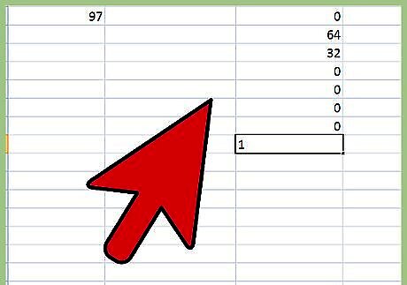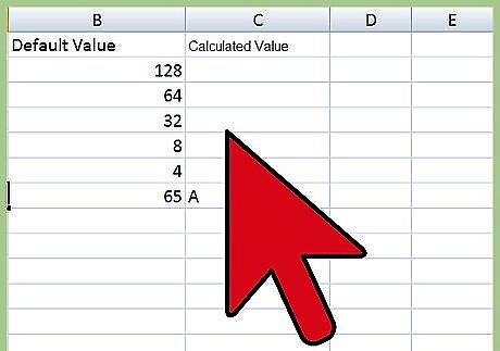 Do the math in Column 2. Figure out which combination of the default values in Column 2 will add up to your letter's decimal value. For the letter "A," whose decimal value is 65, look at the numbers you've already written down in Column 2 and see which add up to 65. Reading Column 2 from top to bottom, you’ll find the second number down is “64,” and the eighth number is “1.” Add these together and you have 65.