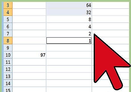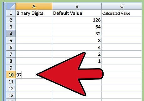 Do the math in Column 2. Figure out which combination of the default values in Column 2 will add up to your letter's decimal value. For the letter "a," whose decimal value is 97, look at the numbers you've already written down in Column 2 and see which add up to 97. Reading Column 2 from top to bottom, you’ll find the second number down is “64,” the third one down is "32," and the eighth number is “1.” Add these together and you have 97.