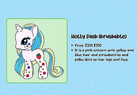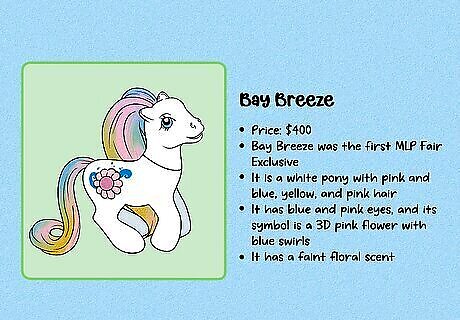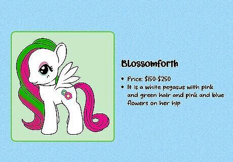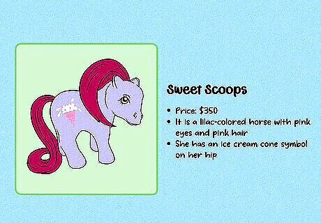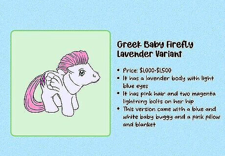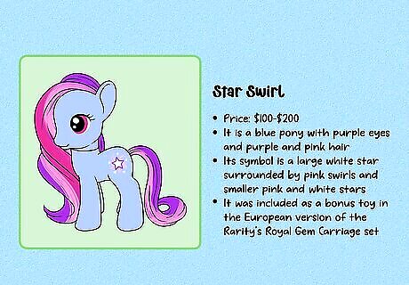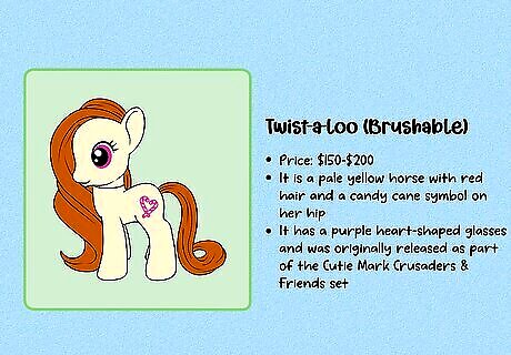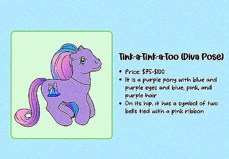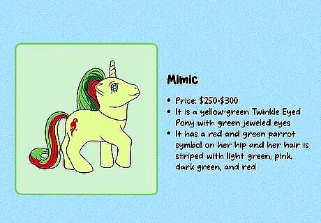 Compare the details to previously-sold figures to estimate a value. First, carefully examine the figure, including the symbol and any marks on the hooves. Then, use a MLP database like the one at Strawberry Reef to identify exactly which figure you have and when it was made. Then, go on an auction site like eBay and search for that exact figure. To get a value for your MLP, look at what other figures have sold for (not just what they’re listed for, since those prices can sometimes be inflated). If you’re thinking of buying a rare MLP, do the same research—double-check all identifying marks to be sure it’s an authentic figure. Then, check similar listings to get an idea of what other collectors are willing to pay.