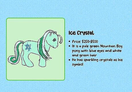 Ice Crystal ($250–$500) Ice Crystal is a pale green Mountain Boy pony with blue eyes and white and green hair. He has sparkling crystals as his symbol, and he originally came with a green frog-shaped brush, puffy sticker, and dark blue ribbon. His hooves are marked “Made in Hong Kong” (except for the version marked “Made in Thailand”). Why is this MLP valuable? Ice Crystal was only sold in the UK, so he’s somewhat hard to find in the U.S. and elsewhere. What’s it worth? Ice Crystal can sell for up to $500 at auction.
