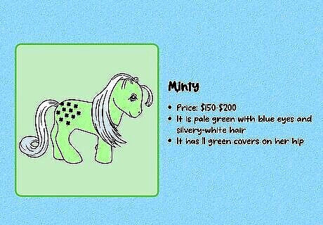 Minty ($150–$200) The first-generation Minty is pale green with blue eyes and silvery-white hair. She has 11 green covers on her hip and originally came with a comb and a ribbon. Why is this MLP valuable? Minty was one of the 6 original My Little Pony toys released in 1983. She’s not especially rare but she’s highly desired by collectors. What’s it worth? A first-generation Minty can sell for up to $200.