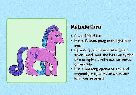 Melody Euro ($350–$400) Melody is a fuschia pony with light blue eyes. Her hair is purple and blue with silver tinsel, and she has the symbol of a saxophone with musical notes on her hip. She’s a battery-operated toy and originally played music when her hair was brushed (although her batteries weren’t replaceable, so most no longer work). Her accessories include a brush and comb and a blue saxophone that makes noise when you blow through it. Why is this MLP valuable? Melody’s musical feature makes her unique—and therefore collectible.Also, she was only released in Europe, so she can be hard to find in the U.S. What’s it worth? Melody can sell for up to $400, but a working version might bring in even more.