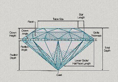 Learn these terms if you want to discuss diamonds like a pro. When you’re talking about the cut of a diamond, each part of the stone has a specific name. They include: Facet: Each flat surface on the diamond Table: The flat surface on the very top of the diamond Crown: The entire top section you see when you look at the diamond from above Girdle: The widest edge, where the top of the stone meets the bottom Pavilion: The bottom section of the stone, from the girdle down Culet: The very bottom point or facet on the stone